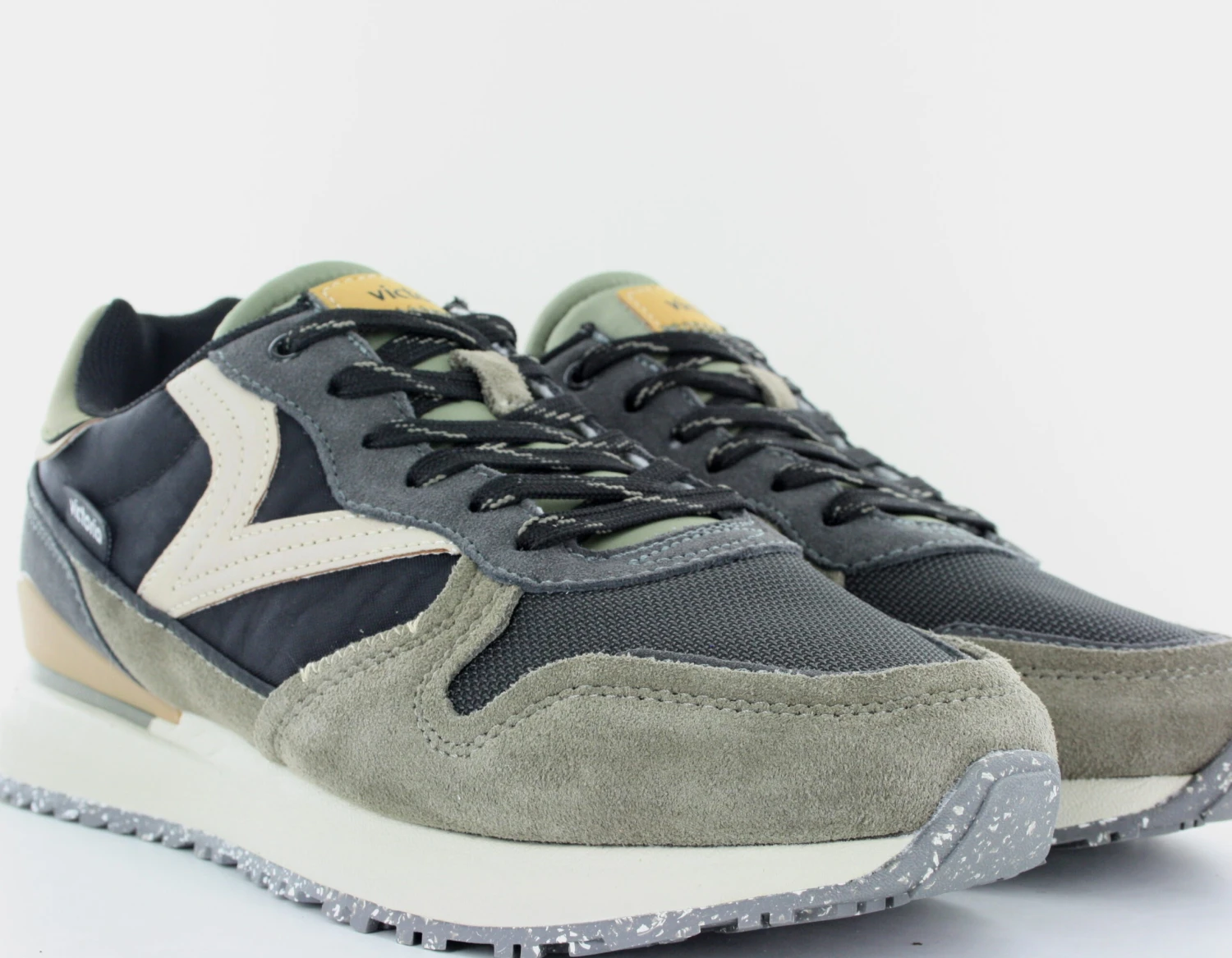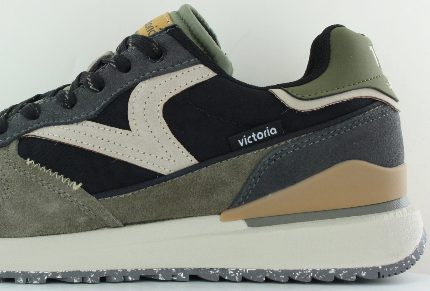 Sneakers pour homme fabriquées en nylon et pièces en cuir fendu superposées. Gravure de 1985 sur le talon et tirette arrière pour faciliter le chaussage. Détail de couleur sur le côté, la pointe et les lacets. Double V de victoria sur le côté en gris.