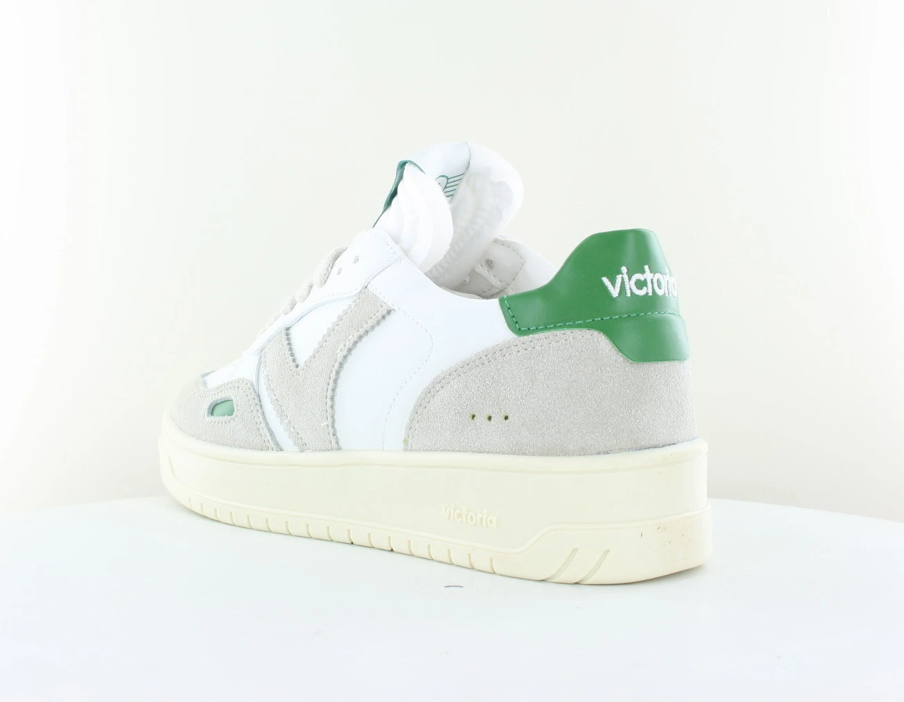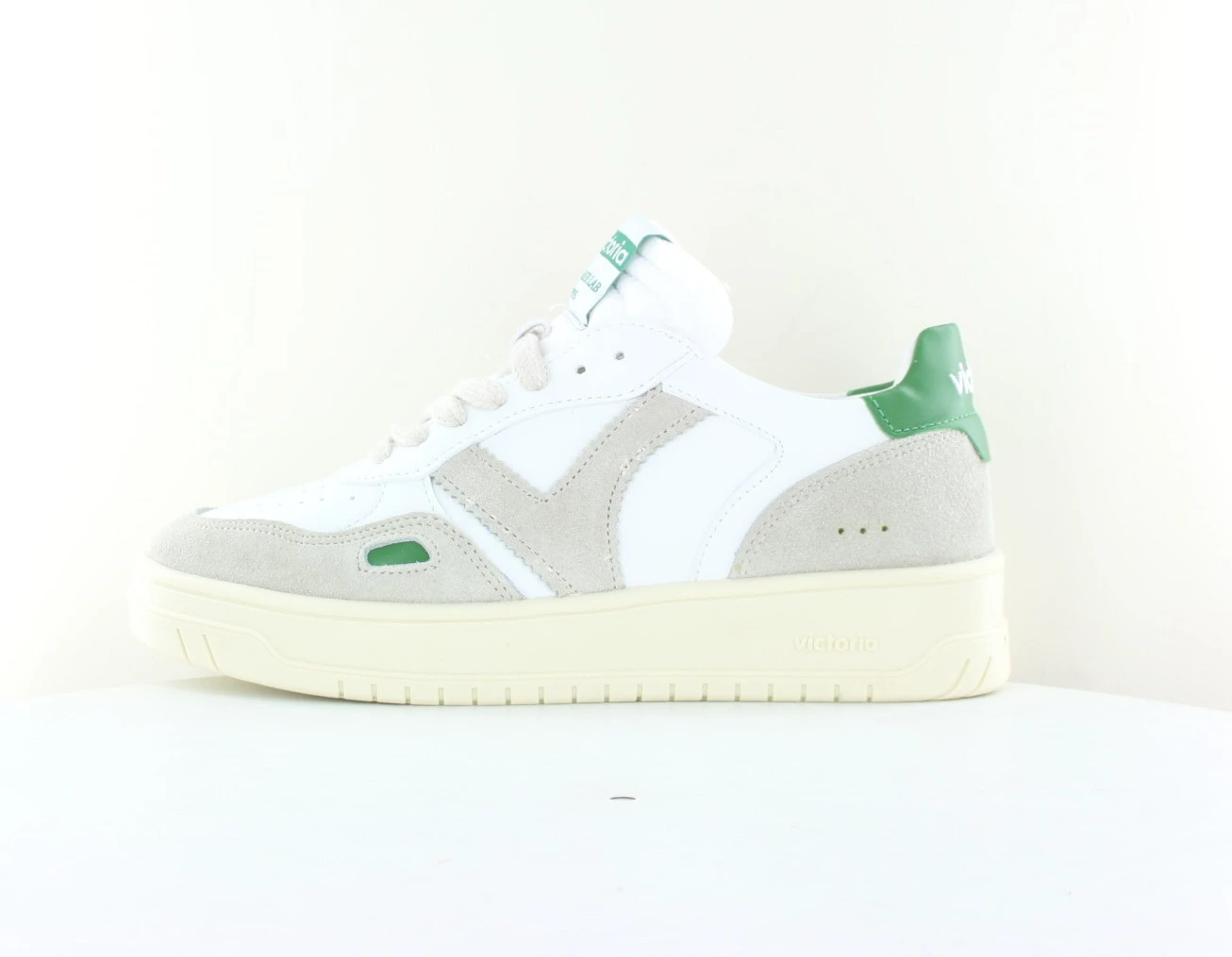 Les Victoria Seul blanc beige vert sont des Baskets pour femme en cuir. V rĂ©tro et dĂ©tail en forme de fenĂȘtre sur le cĂŽtĂ©. La semelle de la Victoria Seul blanc beige vert est lĂ©gĂšrement brune de 3,5 cm et fermeture Ă lacets assortis. Elles disposent d’une semelle intĂ©rieure matelassĂ©e supplĂ©mentaire pour un plus grand confort.